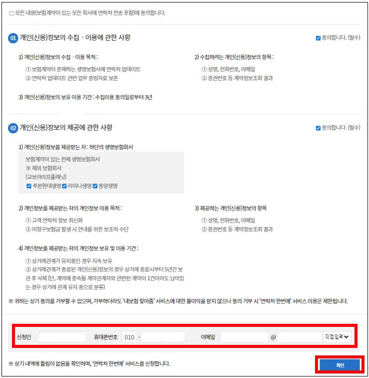 ④ 전부 '동의함' 체크 후 확인 눌러줍니다.
