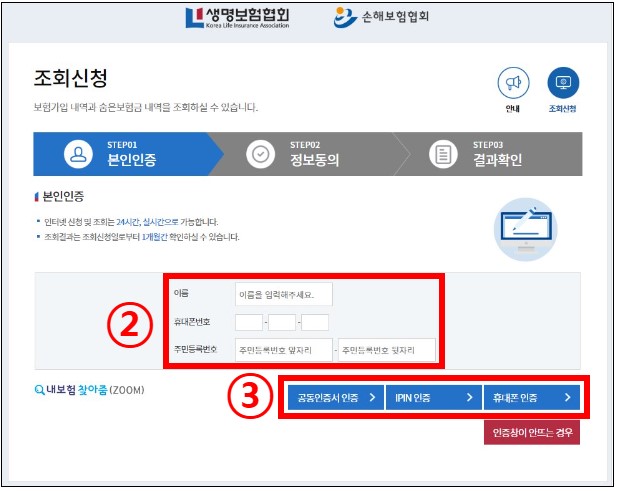 ③ 공동인증서 인증 / 아이핀(IPIN) 인증 / 휴대폰 인증 중 1가지로 본인인증 절차를 진행합니다.