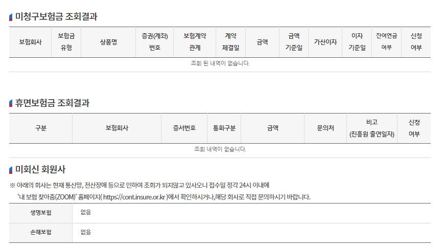 ⑥ 아래로 내리면 [미청구보험금 조회결과] 및 [휴면보험금 조회결과] 확인하실 수 있습니다.