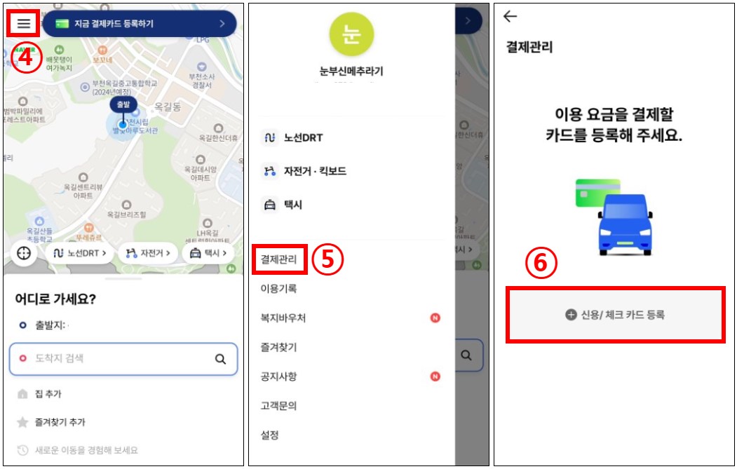 ③ 앱에서 무료 회원가입 후 결제카드·교통카드 모두 등록해야 호출 가능