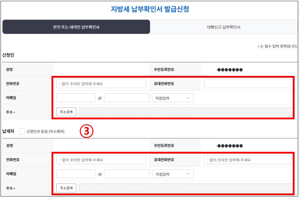 : 신청인과 납세자가 동일할 경우 [신청인과 동일(주소제외)] 클릭